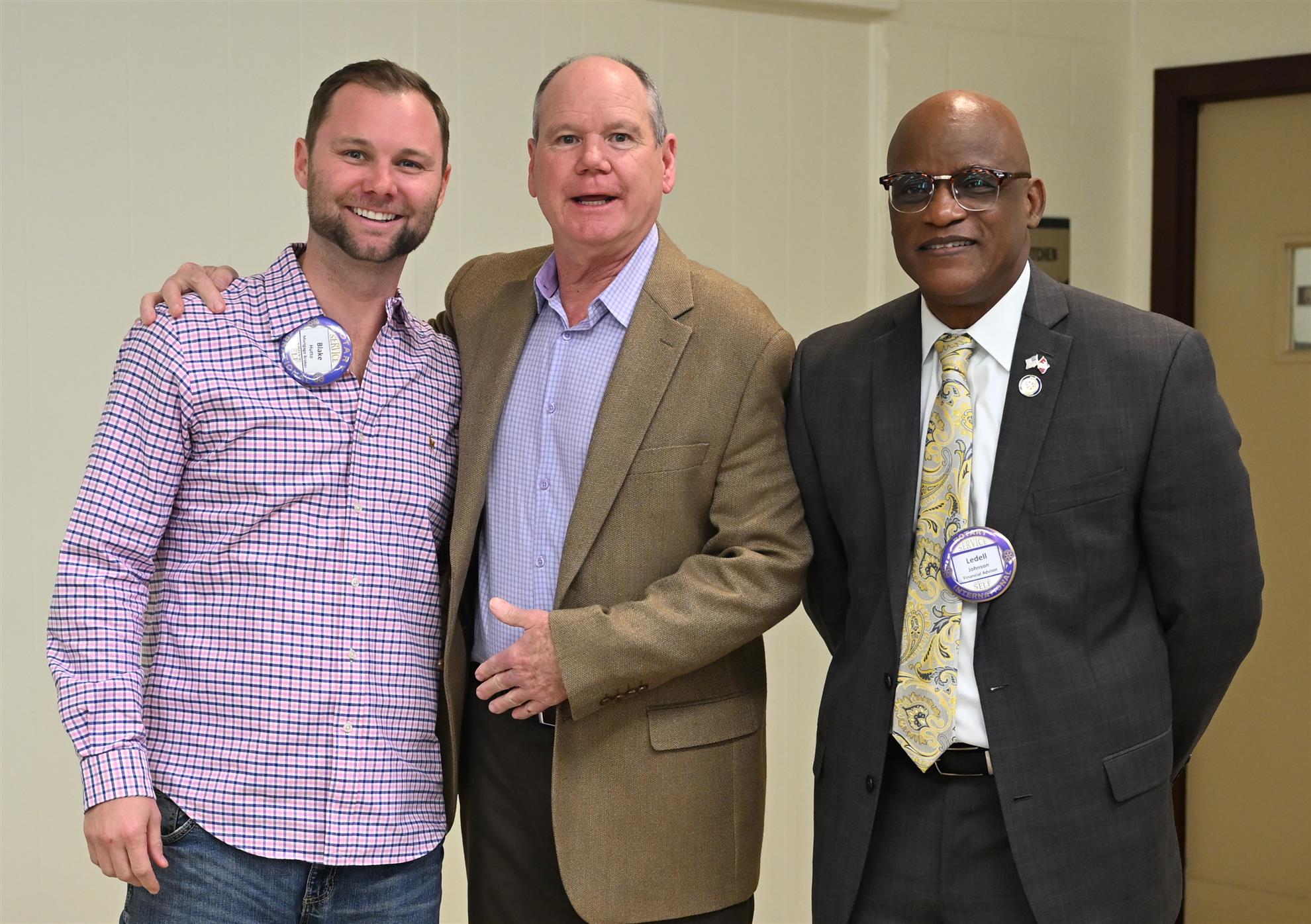 Rotarian Blake Hutto exchanged his red badge for a more permanent blue Rotary badge, courtesy of his father, fellow Rotarian Dean Hutto DDS and Club President Ledell Johnson.